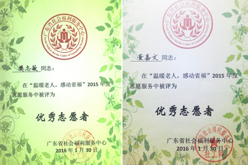 經(jīng)過一年的志愿服務(wù)活動開展,我們的工作得到廣東省社會福利服務(wù)中心的高度肯定和評價,在省福利中心2015年度總結(jié)分享活動中,我院志愿服務(wù)總隊被授予“優(yōu)秀志愿者團隊”榮譽稱號,職能部門志愿服務(wù)分隊隊長樊志敏同志、規(guī)劃三所志愿服務(wù)分隊隊長董嘉雯同志獲得年度“優(yōu)秀志愿者”榮譽稱號。