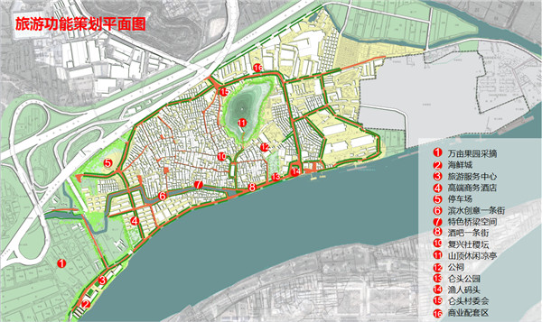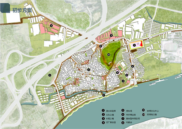 結(jié)合兩方面的分析,提出以鏈接為手段,通過適應(yīng)性設(shè)計,達到社會復(fù)愈的目的。方案構(gòu)建上,提出以休閑橫軸(濱水景觀帶)+精神縱軸(村委會、墓地公園、黎氏宗祠、侖頭公園串聯(lián))構(gòu)建為骨架,重點改造兩大片區(qū)(舊村居住、工業(yè)廠房),活化六大節(jié)點(停車場、市井商業(yè)街、復(fù)合型市場、村委會及前廣場、宗祠文化中心、墓地公園)的系統(tǒng)性框架。