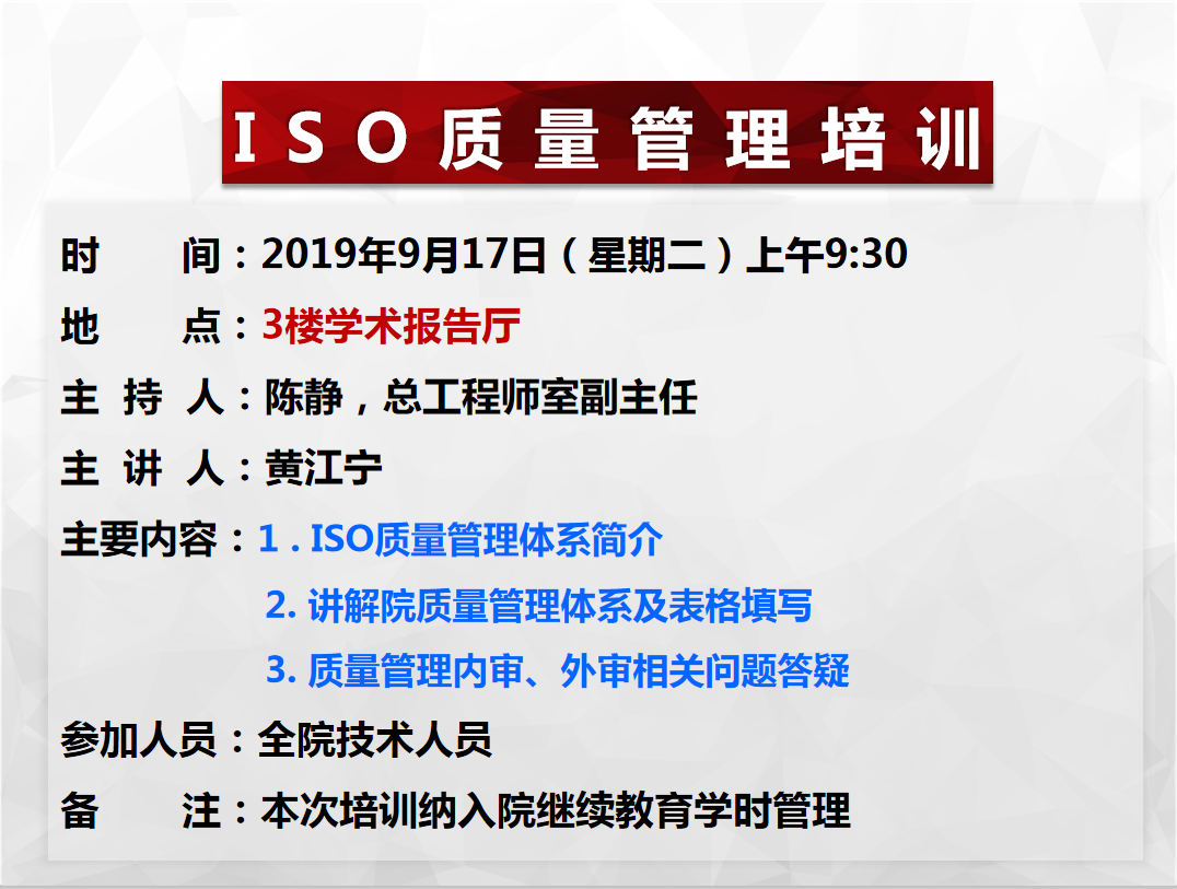 總工程師室將于9月17日在三樓學(xué)術(shù)報告廳組織ISO質(zhì)量管理培訓(xùn)。