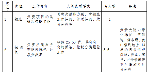4.服務形式:全年每天07:00-18:00保潔、垃圾分類工作。