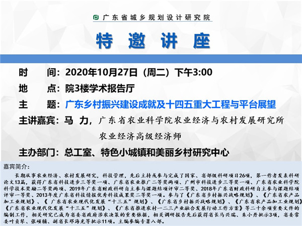 2020年10月27日(周二),特邀廣東省農(nóng)業(yè)科學(xué)院農(nóng)業(yè)經(jīng)濟(jì)與農(nóng)村發(fā)展研究所農(nóng)業(yè)經(jīng)濟(jì)高級(jí)經(jīng)濟(jì)師馬力教授為我們開展廣東鄉(xiāng)村振興建設(shè)成就及十四五重大工程與平臺(tái)展望講座。