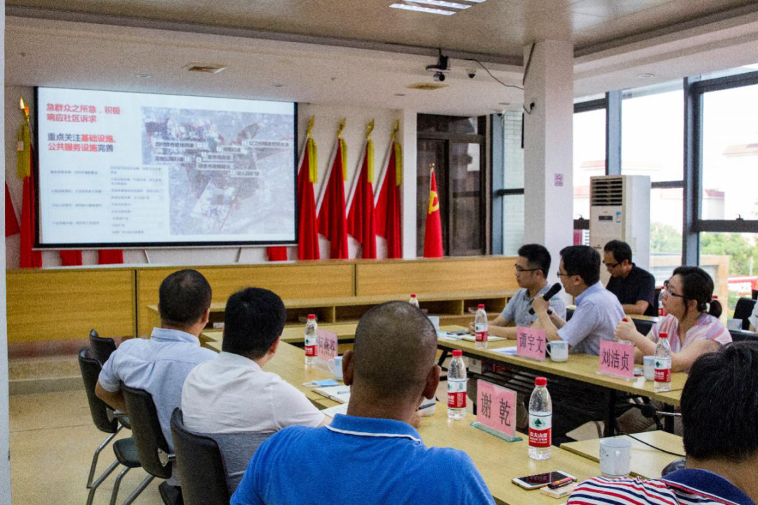 ▲規(guī)劃四所、建筑設(shè)計院黨員與大鎮(zhèn)社區(qū)村委溝通規(guī)劃設(shè)計方案