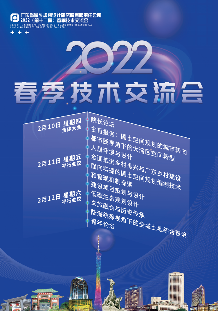 省城規(guī)院2022春季技術(shù)交流會將于2月10日-2月12日舉行,粵規(guī)院人齊聚一堂,聆聽發(fā)展戰(zhàn)略新布局,共享行業(yè)動向新趨勢,齊聞青年精英新觀點,精彩不容錯過!