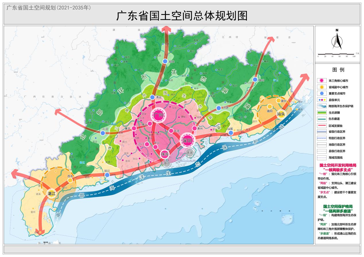 工作內(nèi)容與特色:在新時(shí)代新起點(diǎn)上深刻把握廣東新使命新?lián)?dāng),《規(guī)劃》全面對(duì)標(biāo)習(xí)近平總書記的重要講話和指示批示精神,深入貫徹省委省政府工作部署,圍繞落實(shí)國家戰(zhàn)略要求,順應(yīng)廣東自然地理格局特征和城鎮(zhèn)化發(fā)展趨勢,著力在破解國土空間開發(fā)保護(hù)突出矛盾和問題過程中推動(dòng)高質(zhì)量發(fā)展,提出未來十五年內(nèi)全省國土空間開發(fā)保護(hù)的總體格局和安排。《規(guī)劃》提出“一核兩極多支點(diǎn)”的國土空間開發(fā)利用格局和“一鏈兩屏多廊道”的國土空間保護(hù)格局;以“四空間、兩體系”統(tǒng)籌國土空間安排,包括營造興旺和美的農(nóng)業(yè)空間,塑造山清水秀的生態(tài)空間,筑造集約高效的城鎮(zhèn)空間,打造開放活力的海洋空間,構(gòu)建詩意棲居的嶺南魅力空間體系,健全綠色安全的基礎(chǔ)設(shè)施支撐體系。