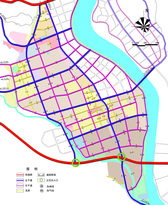 工業(yè)區(qū)在企業(yè)招商中,企業(yè)規(guī)模、進(jìn)駐時間有很大的不確定性,硬性規(guī)定的道路網(wǎng)將不能適應(yīng)不同規(guī)模企業(yè)的進(jìn)駐。因此,規(guī)劃引入了彈性控制路網(wǎng)的方法,將路網(wǎng)分為結(jié)構(gòu)性路網(wǎng)和彈性路網(wǎng)。其中彈性路網(wǎng)可根據(jù)企業(yè)規(guī)模、進(jìn)駐時間等因素靈活調(diào)整走向、劃分工業(yè)地塊,同時也能夠保障工業(yè)區(qū)的通達(dá)性和規(guī)劃結(jié)構(gòu)的完整性。
