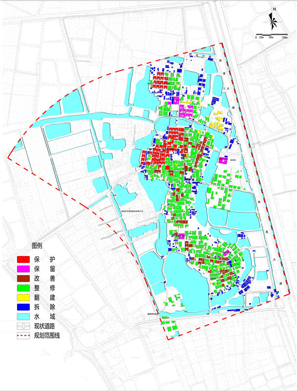 深入調(diào)研阮涌村的嶺南水鄉(xiāng)格局,對文物單位、古圍墻、牌坊等要素逐一登記編號,并對古村落的人文傳統(tǒng)、村落肌理、風(fēng)貌等進(jìn)行全面梳理,提取文物古建等核心保護(hù)要素;重點(diǎn)活化保護(hù)文物古跡,通過修補(bǔ)植入的手法,明確古村落內(nèi)部保護(hù)、保留、改善、整修、翻建、拆除六類建筑形式,通過提取文物古建等核心保護(hù)要素,保護(hù)古村落的精髓和神韻。規(guī)劃將阮北坊“八大家”和大夫區(qū)公祠的保護(hù)聯(lián)系起來,配合建設(shè)擺渡碼頭、戲臺、商業(yè)街、游客中心,著重整合巷道空間,重現(xiàn)古時(shí)的青石板路景象;阮西坊則側(cè)重嶺南民居風(fēng)貌的營造,突出村莊建筑肌理恢復(fù)與環(huán)境品質(zhì)的提升,并培育新的功能;此外,規(guī)劃以原有阮涌八景為基礎(chǔ),通過對環(huán)境整治和氛圍烘托,逐步營造恢復(fù)“雙橋晚釣、東社榕蔭、阮水環(huán)潮”等阮涌新八景,增強(qiáng)古村落對嶺南文化的傳承與創(chuàng)新。