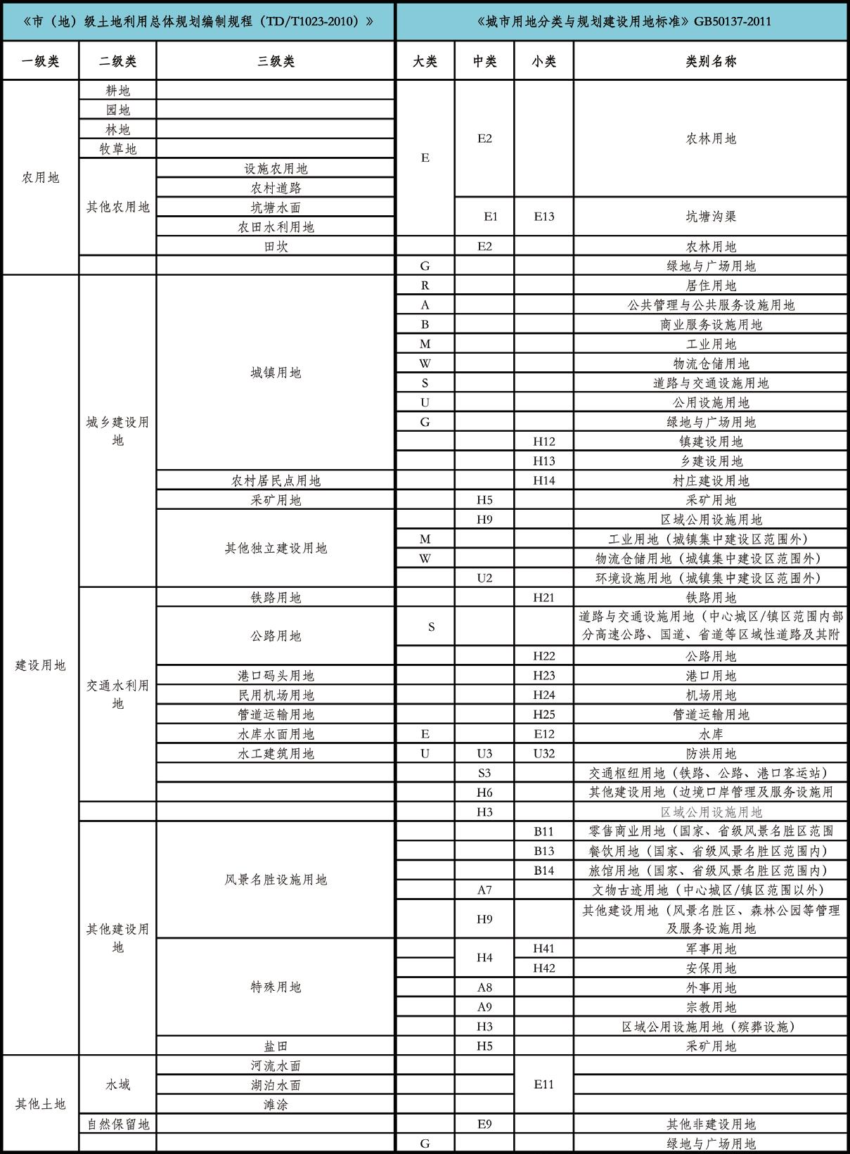 以《城市用地分類與規(guī)劃建設(shè)用地標準(GB50137—2011)》、《市(地)級土地利用總體規(guī)劃編制規(guī)程(TD/T1023—2010)》為基礎(chǔ),建立兩規(guī)用地協(xié)調(diào)標準。協(xié)調(diào)標準細分到小類,便于銜接控制詳細規(guī)劃。