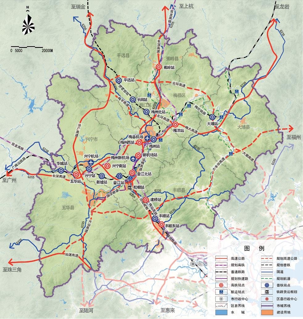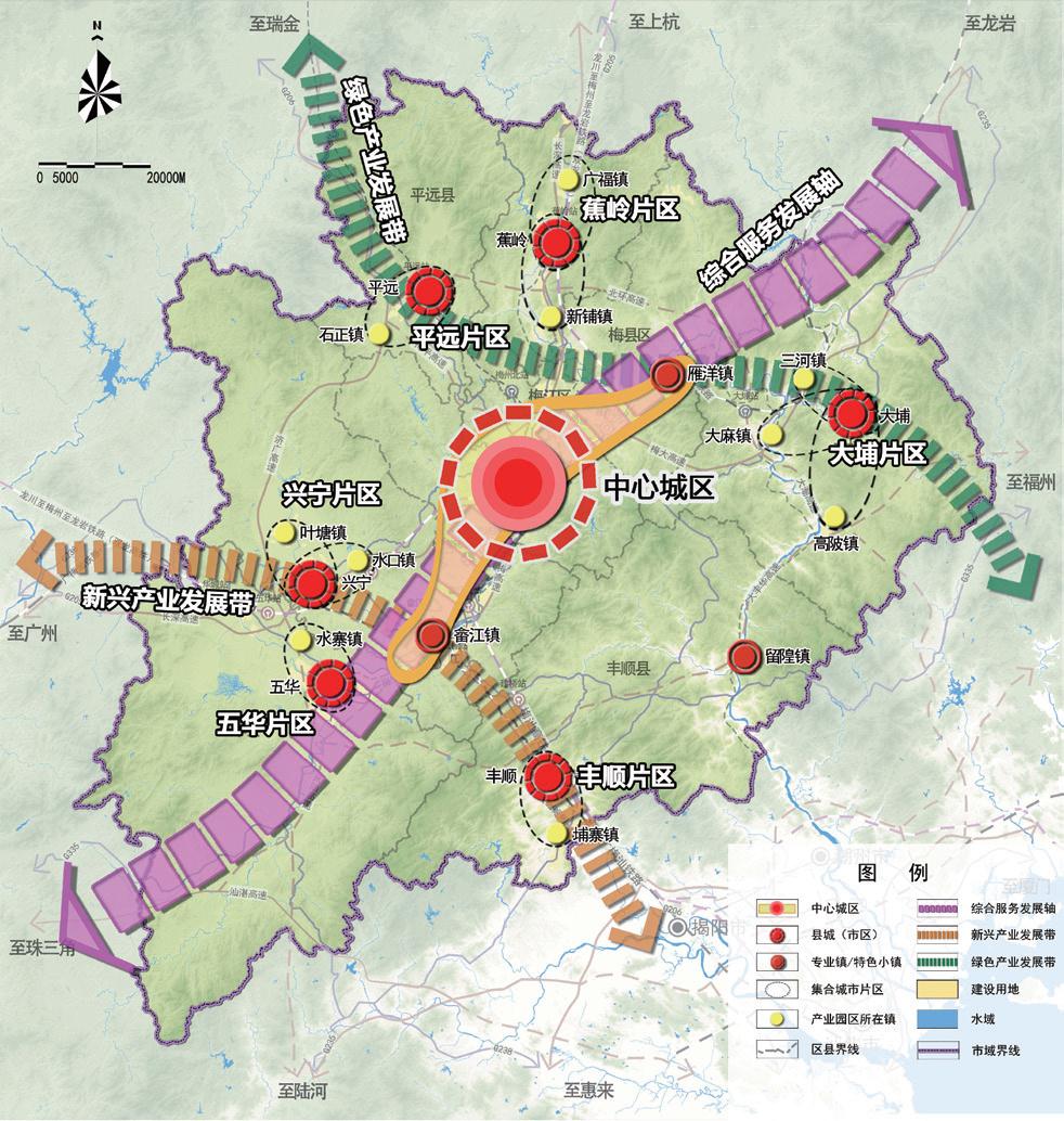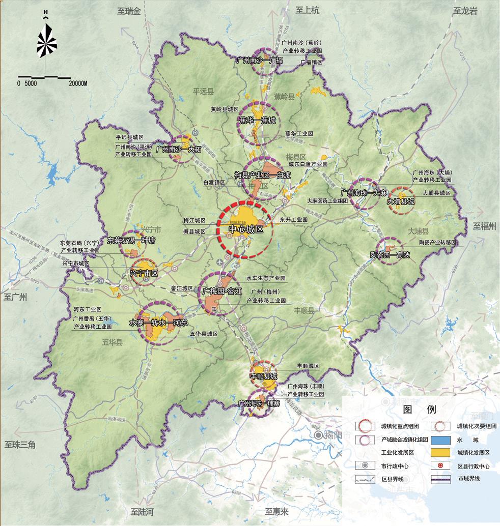 《規(guī)劃》立足梅州“兩大政策”,對接粵港澳大灣區(qū)發(fā)展,通過構(gòu)建西承珠三角、南通汕潮揭的次沿海區(qū)域合作格局,將承接珠三角和港澳地區(qū)輻射帶動以及打通山區(qū)出海大通道作為區(qū)域協(xié)作的主要方向。通過構(gòu)建“一區(qū)六組群多節(jié)點(diǎn)”的梅州新型城鎮(zhèn)化空間格局,為梅州建設(shè)潮汕平原北上開拓腹地的樞紐提供了重要支撐。規(guī)劃還結(jié)合梅州產(chǎn)業(yè)轉(zhuǎn)移工業(yè)園發(fā)展實(shí)際,重點(diǎn)提出要加強(qiáng)產(chǎn)業(yè)園區(qū)所在城鎮(zhèn)的城鎮(zhèn)化發(fā)展,推進(jìn)鎮(zhèn)區(qū)與園區(qū)共享優(yōu)質(zhì)公共服務(wù)資源、共建共享市政基礎(chǔ)設(shè)施,實(shí)現(xiàn)以產(chǎn)興城、以城聚產(chǎn)和產(chǎn)城融合,成為吸引市域廣大農(nóng)業(yè)轉(zhuǎn)移人口就地就近城鎮(zhèn)化的主要載體。