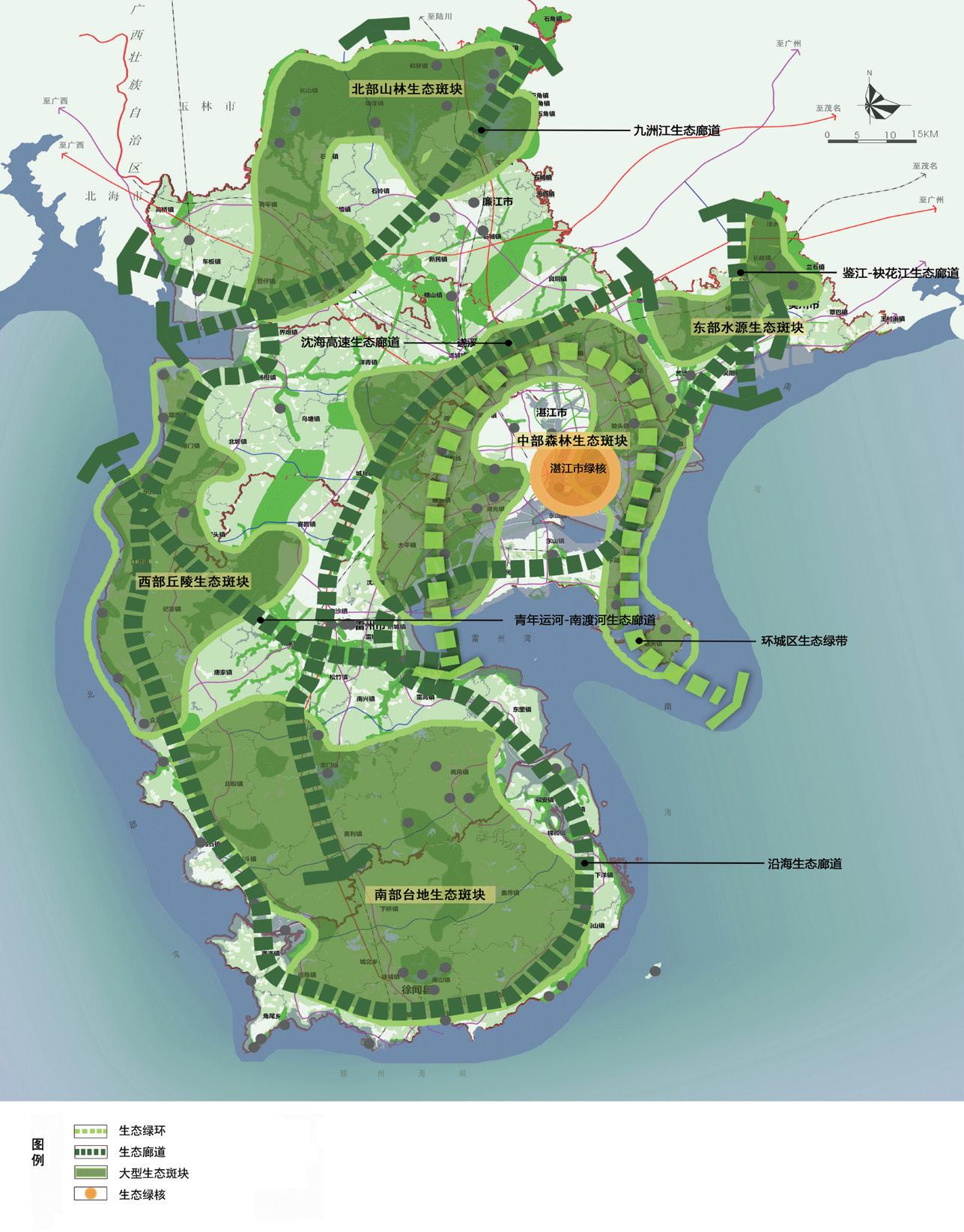 新時期湛江市委、市政府提出建設(shè)生態(tài)型海灣城市,踐行海綿城市、循環(huán)城市和腳印城市“三個城市”理念,創(chuàng)建國家生態(tài)園林城市,同時更好指導(dǎo)下一階段城市綠地建設(shè)的方向和路徑。規(guī)劃以建設(shè)“生態(tài)海灣城市”、“生態(tài)園林城市”、“綠化特色名城”為目標(biāo),以“海陸統(tǒng)籌”、“滲透與鏈接”、“功能復(fù)合”、“特色提升”、“關(guān)注實施”為理念,構(gòu)建“一核五片、一環(huán)五廊”的市域綠地系統(tǒng)格局,規(guī)劃形成“一灣兩岸,六楔九廊,多園點綴”的城市綠地系統(tǒng)結(jié)構(gòu)。