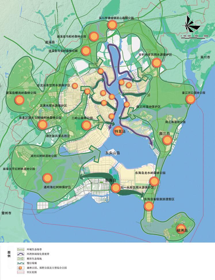 與總規(guī)、片區(qū)控規(guī)同步編制,強調(diào)規(guī)劃傳遞性,根據(jù)行政分區(qū)、城鄉(xiāng)規(guī)劃主管部門劃分的控規(guī)編制單元,將綠地率、人均公園綠地、公園可達(dá)范圍覆蓋率、市區(qū)級公園及綠廊作為各分區(qū)、管理單元綠地規(guī)劃的剛性控制,因區(qū)而異的把綠規(guī)總體指標(biāo)分解。以湛江豐富的自然與人文資源為依托,構(gòu)建“田、城、河、灣、島”特色景觀格局,針對各區(qū)提出差異化特色公園建設(shè)指引,作為管理單元彈性控制內(nèi)容。