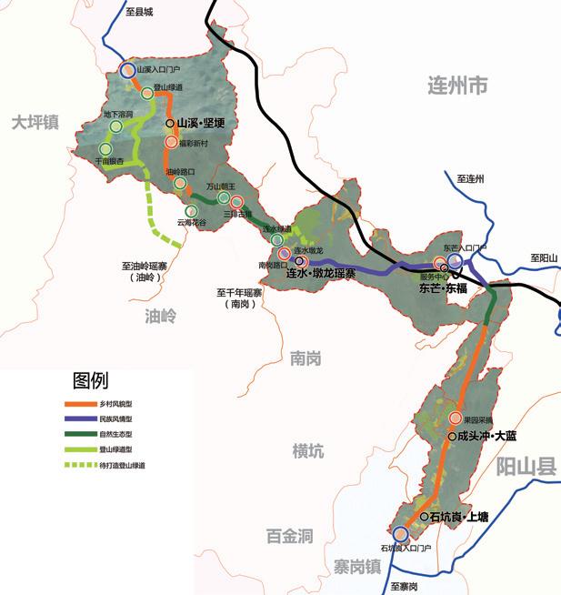 規(guī)劃創(chuàng)新地選取了 “道口經(jīng)濟”的發(fā)展思路,挖掘清連高速水足塘道口的人群駐留效應(yīng),依托省道 261 線將交通道口吸納的人流、車流引入縣域內(nèi)部,提升縣域內(nèi)部旅游資源可達性。沿省道 261 線強化公共服務(wù)功能、游客游覽導引,通過交通優(yōu)勢帶動縣域旅游資源一體化開發(fā)。