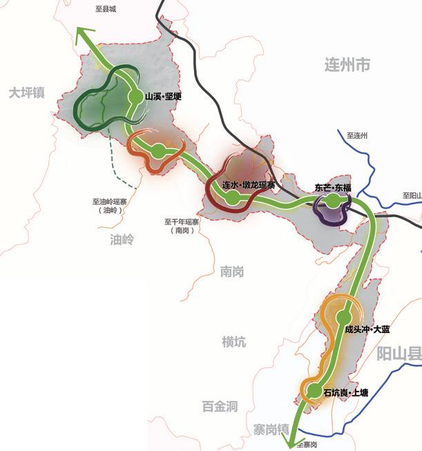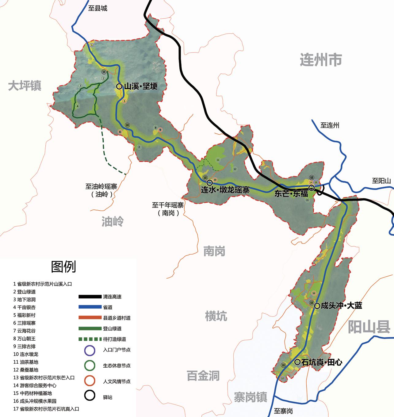 本次規(guī)劃選取的省級新農(nóng)村示范片范圍依托省道 261 線和清連高速水足塘下道口,串聯(lián)起山溪、連水、東芒、成頭沖、石坑崀五個重點村,總面積 50.3km2。通過“鏈珠工程”、“道口工程”、“美化工程”、“幸福工程”四大舉措推進示范片建設(shè),優(yōu)化示范片內(nèi)人居環(huán)境,建立瑤族新瑤寨,傳承瑤族特色文化。通過“三一結(jié)合”的產(chǎn)業(yè)發(fā)展路徑,增加農(nóng)民收入,提升農(nóng)民幸福感,將示范片打造成為一個“美麗瑤寨,幸?,?br />
