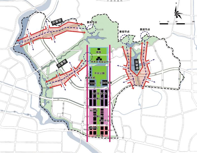 規(guī)劃形成城市建設(shè)工程、交通運(yùn)輸、工業(yè)制造及信息化三個(gè)校園組團(tuán)。結(jié)合軌道交通樞紐規(guī)劃城際共享帶,打造面向區(qū)域的產(chǎn)學(xué)研共享中心;組團(tuán)內(nèi)規(guī)劃校際共享帶促進(jìn)學(xué)生交流和設(shè)施共享,形成一軸三帶三組團(tuán)的規(guī)劃結(jié)構(gòu)。