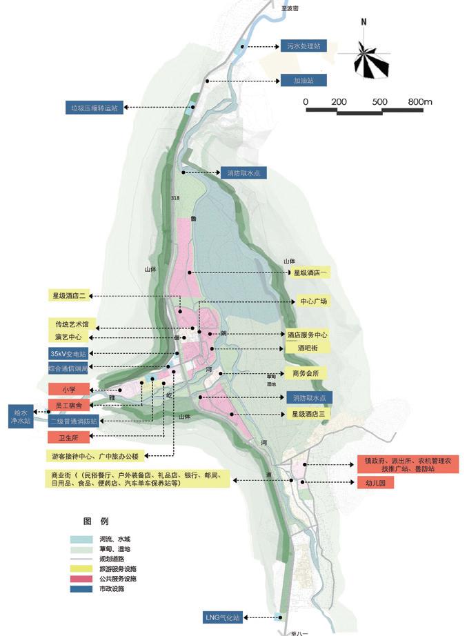 規(guī)劃采用構(gòu)建各分區(qū)內(nèi)部路網(wǎng),設(shè)置連續(xù)而獨(dú)立的慢行系統(tǒng),設(shè)置隔音土丘和林帶,以電瓶車(chē)為內(nèi)部交通工具等降噪技術(shù)措施,構(gòu)建了“寧?kù)o”的交通系統(tǒng)。采用重力流形式引入魯朗河和雅屹河河水作為小鎮(zhèn)內(nèi)部景觀水;結(jié)合當(dāng)?shù)亟涤炅?、綠化率以及道路系統(tǒng),采用生態(tài)草溝、雨水濕地花園等低影響技術(shù)取代傳統(tǒng)排水溝,解決降水自然滲透和安全排放;利用“膜生物反應(yīng)器—人工濕地工藝”,確保再生水達(dá)到市政雜用水要求。實(shí)施光屋頂計(jì)劃,使規(guī)劃區(qū)內(nèi)建筑均可進(jìn)行太陽(yáng)能光熱利用或光伏發(fā)電,道路及景觀照明均采用太陽(yáng)能 LED 系統(tǒng),推動(dòng)小鎮(zhèn)能源綠色化。