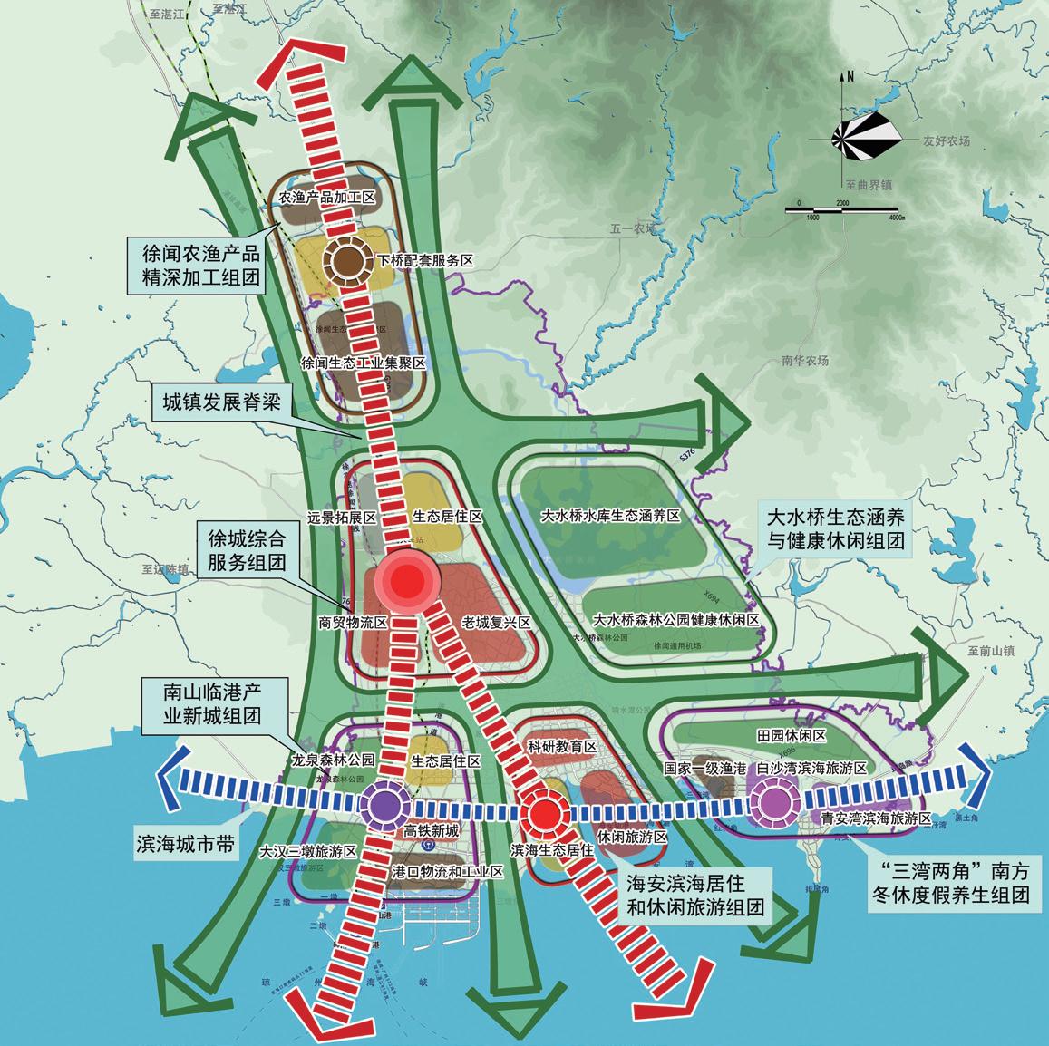 規(guī)劃形成徐城綜合服務(wù)組團(tuán)、徐聞臨港物流園與海洋產(chǎn)業(yè)組團(tuán)、海安濱海居住及休閑旅游組團(tuán)、“三灣兩角”南方冬休度假養(yǎng)生組團(tuán)、徐聞生態(tài)工業(yè)集聚組團(tuán)、大水橋生態(tài)涵養(yǎng)與健康休閑組團(tuán)六大空間集約、有機(jī)生長的“一城六組團(tuán)”,防止城市攤大餅式蔓延。