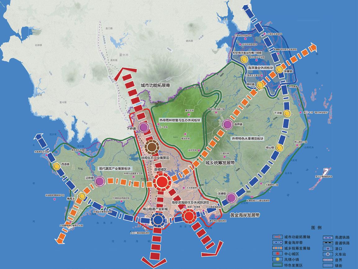 產(chǎn):南部臨港產(chǎn)業(yè)集聚區(qū)和下橋生態(tài)工業(yè)集聚區(qū);城:徐城舊城更新與海安新城;人:完善設(shè)施配套,促進(jìn)本地人口就近城鎮(zhèn)化,吸引人才進(jìn)駐徐聞;文:推動(dòng)歷史城區(qū)和街區(qū)活化,發(fā)掘大漢三墩絲路始港遺跡。