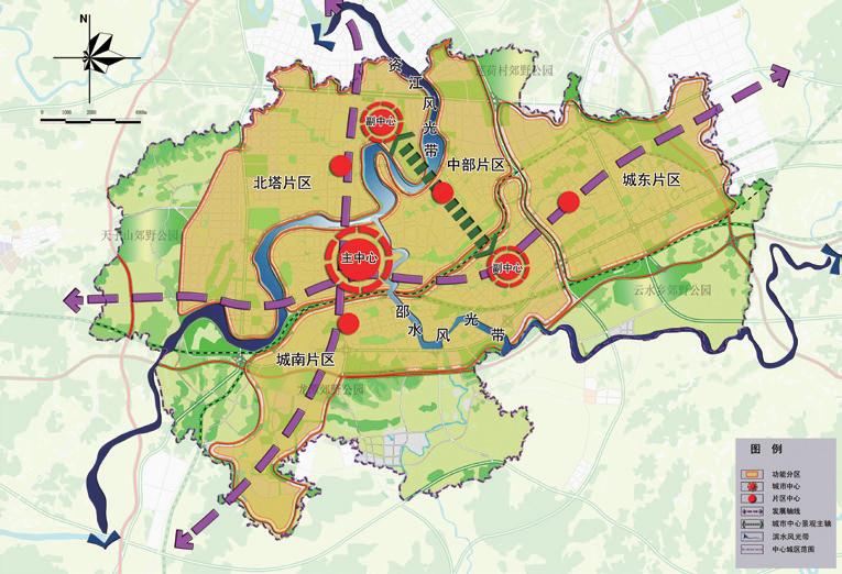 規(guī)劃中心城區(qū)形成“兩帶、三軸、四片、多組團(tuán)”的用地空間結(jié)構(gòu)。