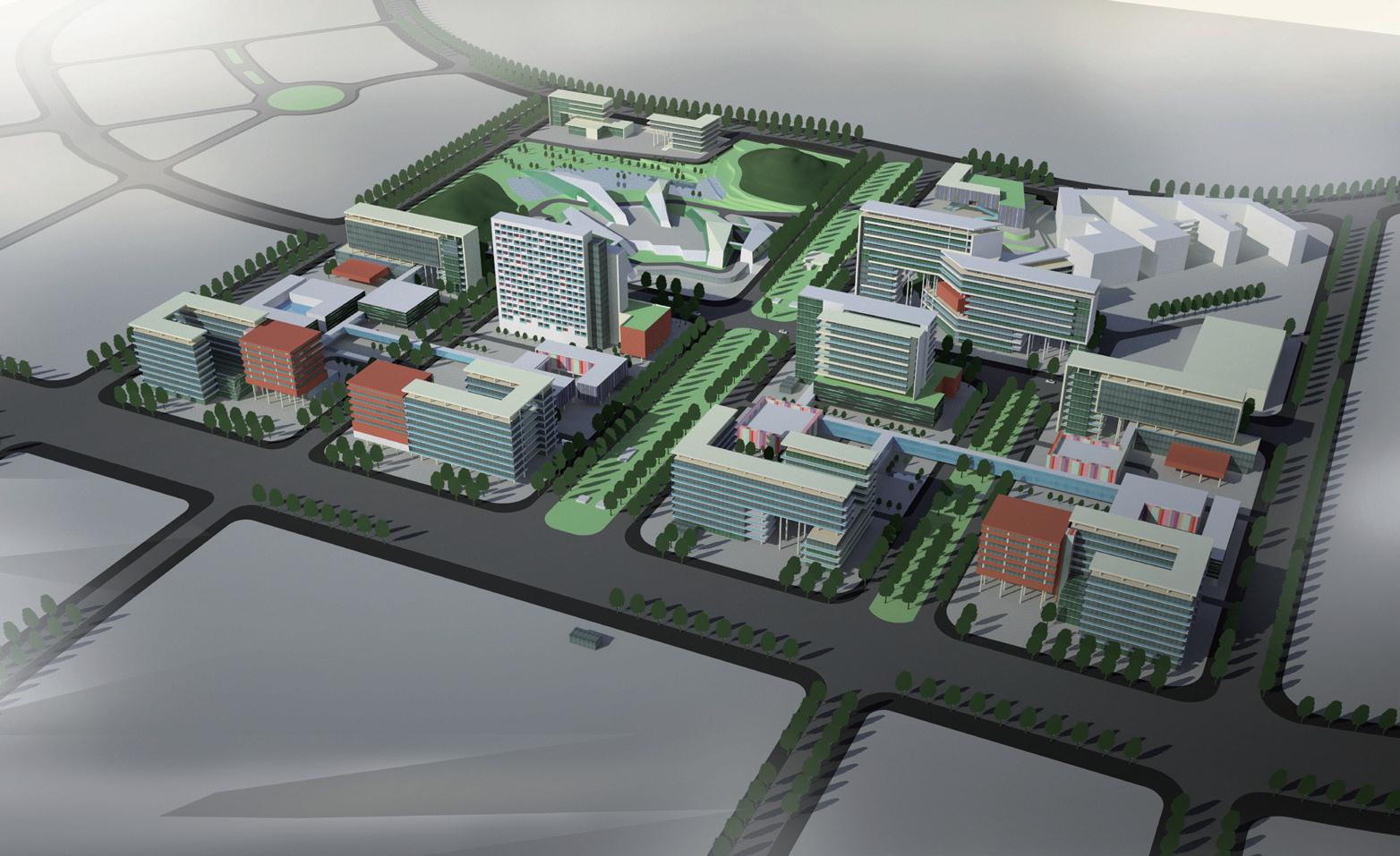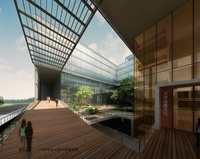 園區(qū)位于大學城中軸線的核心區(qū)域,城市景觀地位突出,規(guī)劃設計從城市空間形式、建筑的體量、色彩等多方面取得與周邊環(huán)境的協(xié)調。