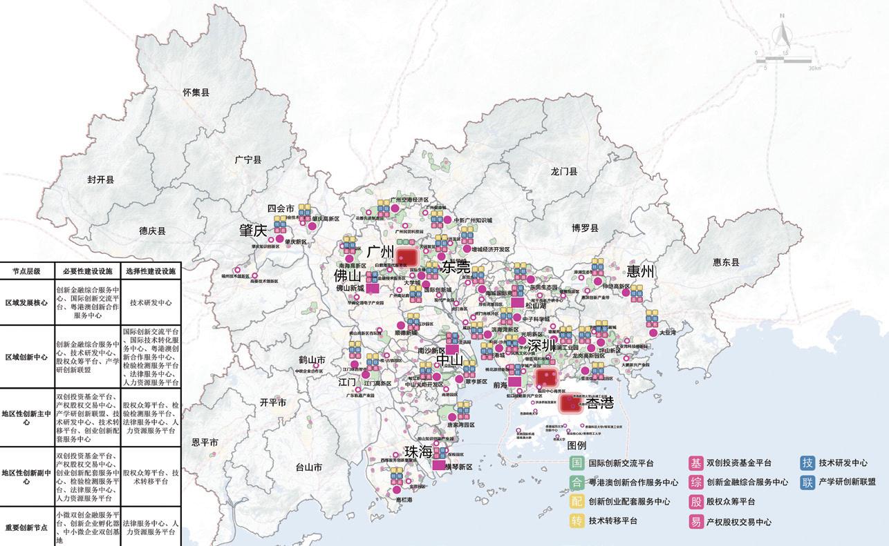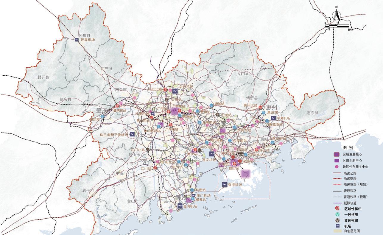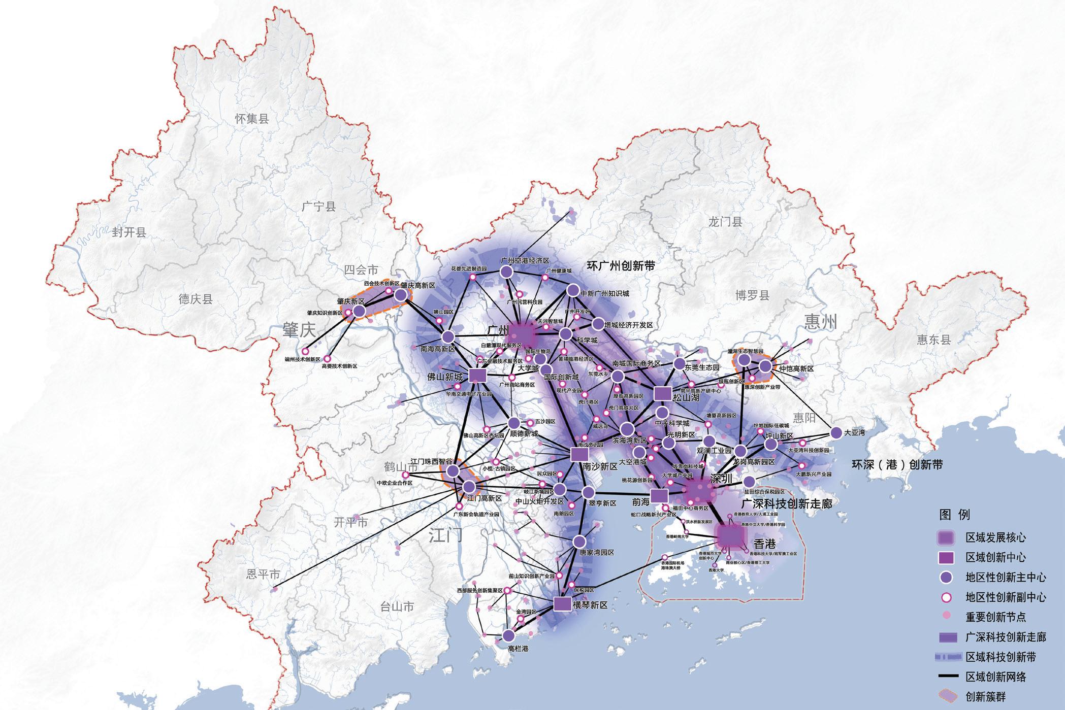 規(guī)劃形成“兩核、五副”、 “一廊、兩帶”、 “多節(jié)點、簇群式、網(wǎng)絡(luò)化”的創(chuàng)新發(fā)展格局。其中:兩核包括廣州中心區(qū)、深圳中心區(qū);五副(五大區(qū)域創(chuàng)新中心)包括廣州南沙新區(qū)、深圳前海、珠海橫琴新區(qū)、佛山新城、東莞松山湖;一廊是指廣深科技創(chuàng)新走廊;兩帶是指環(huán)廣州、環(huán)深(港)兩條科技創(chuàng)新發(fā)展帶;以“廣、深”為核心,以區(qū)域創(chuàng)新中心、地區(qū)性創(chuàng)新主中心、地區(qū)性創(chuàng)新副中心、重要創(chuàng)新節(jié)點等不同層級節(jié)點為支撐。以廣深科技創(chuàng)新走廊為脊梁,圍繞“兩核、五副”向外輻射,形成功能互補、層級完善的區(qū)域創(chuàng)新網(wǎng)絡(luò)。
