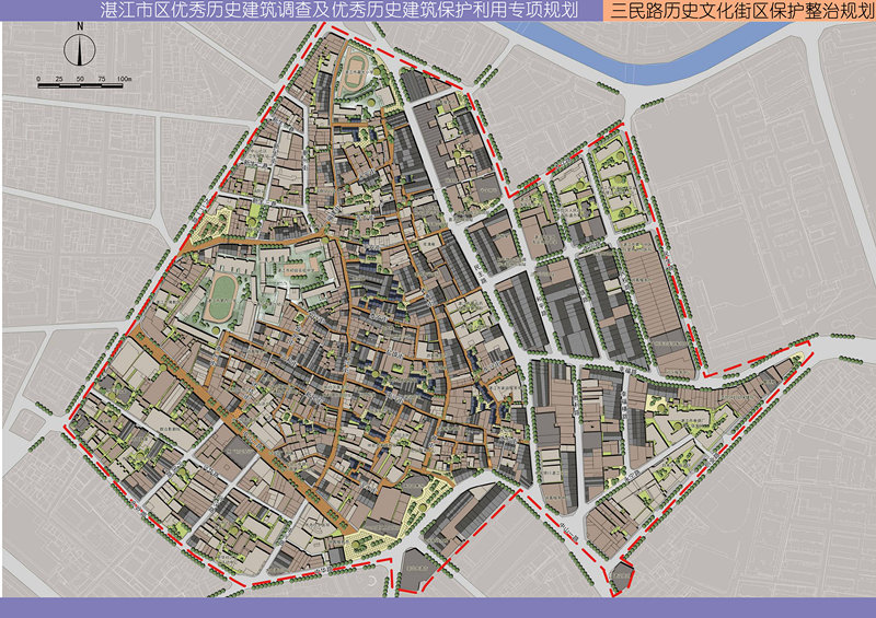 規(guī)劃按照保護(hù)歷史建筑原真性、風(fēng)貌完整性原則;堅持原址保護(hù)原則;保護(hù)與合理利用相結(jié)合的原則,對優(yōu)秀歷史建筑劃定本體范圍、保護(hù)范圍、建設(shè)控制地帶三個層級的區(qū)劃保護(hù),共劃定了148處優(yōu)秀歷史建筑保護(hù)利用專項規(guī)劃圖則。規(guī)劃對赤坎區(qū)三民路歷史文化街區(qū)核心區(qū)與霞山區(qū)歷史文化街區(qū)編制了保護(hù)整治規(guī)劃,制定了《湛江市區(qū)優(yōu)秀歷史建筑與歷史文化街區(qū)保護(hù)辦法》,對重點(diǎn)優(yōu)秀歷史建筑編制了測繪與修繕方案。