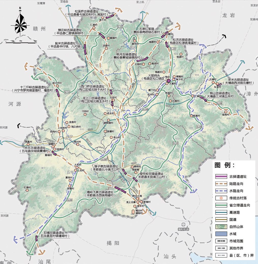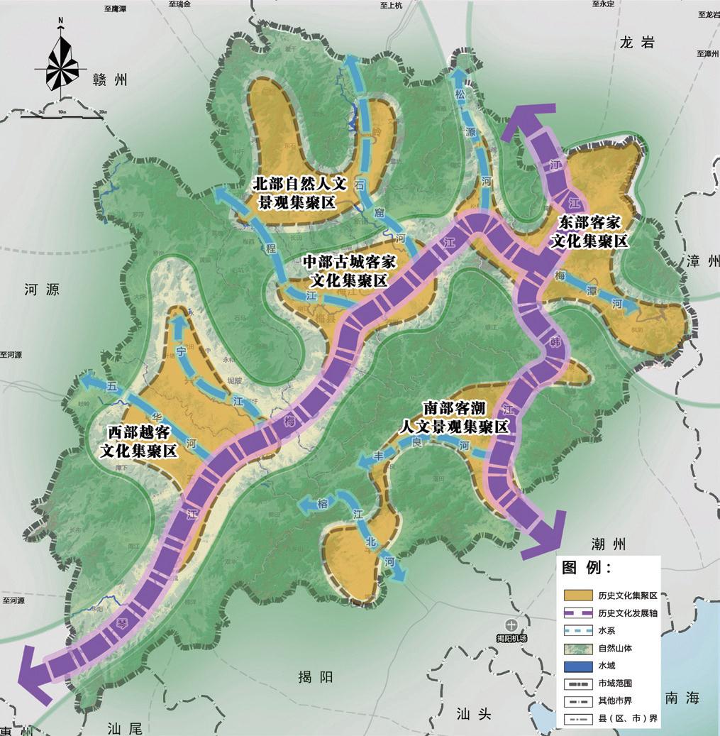 規(guī)劃高度重視歷史文化脈絡(luò)研究,不僅研究歷史沿革過程中地位變化對梅州文化構(gòu)成的影響,還對客家文化遷徙的演變進(jìn)行考據(jù)研究,突出由“客家腹地”、“客家文化中心”到“世界客都”的歷程,為確定保護(hù)框架、保護(hù)要素提供支撐,最終在空間上勾勒并落實歷史文化保護(hù)、展示路線,做到古為今用。