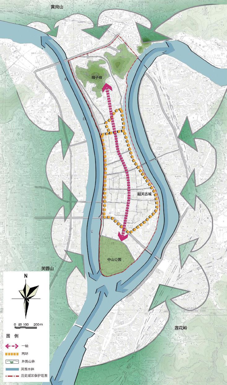 ⑵歷史文化名城層面形成“六山三水、一軸兩環(huán)”的保護結構
