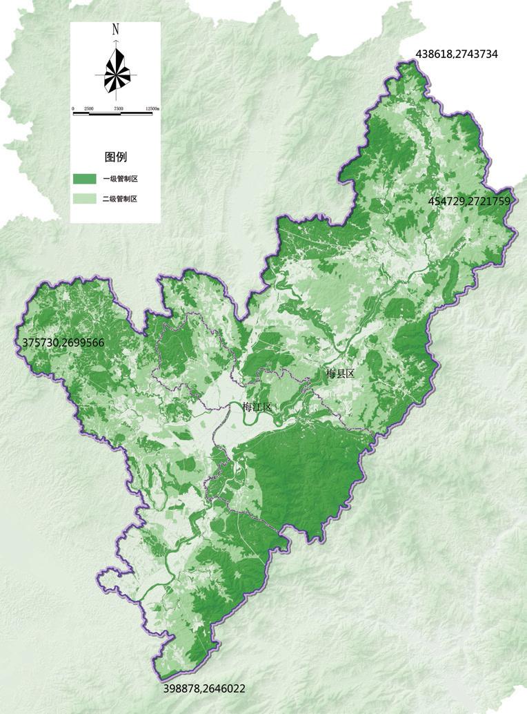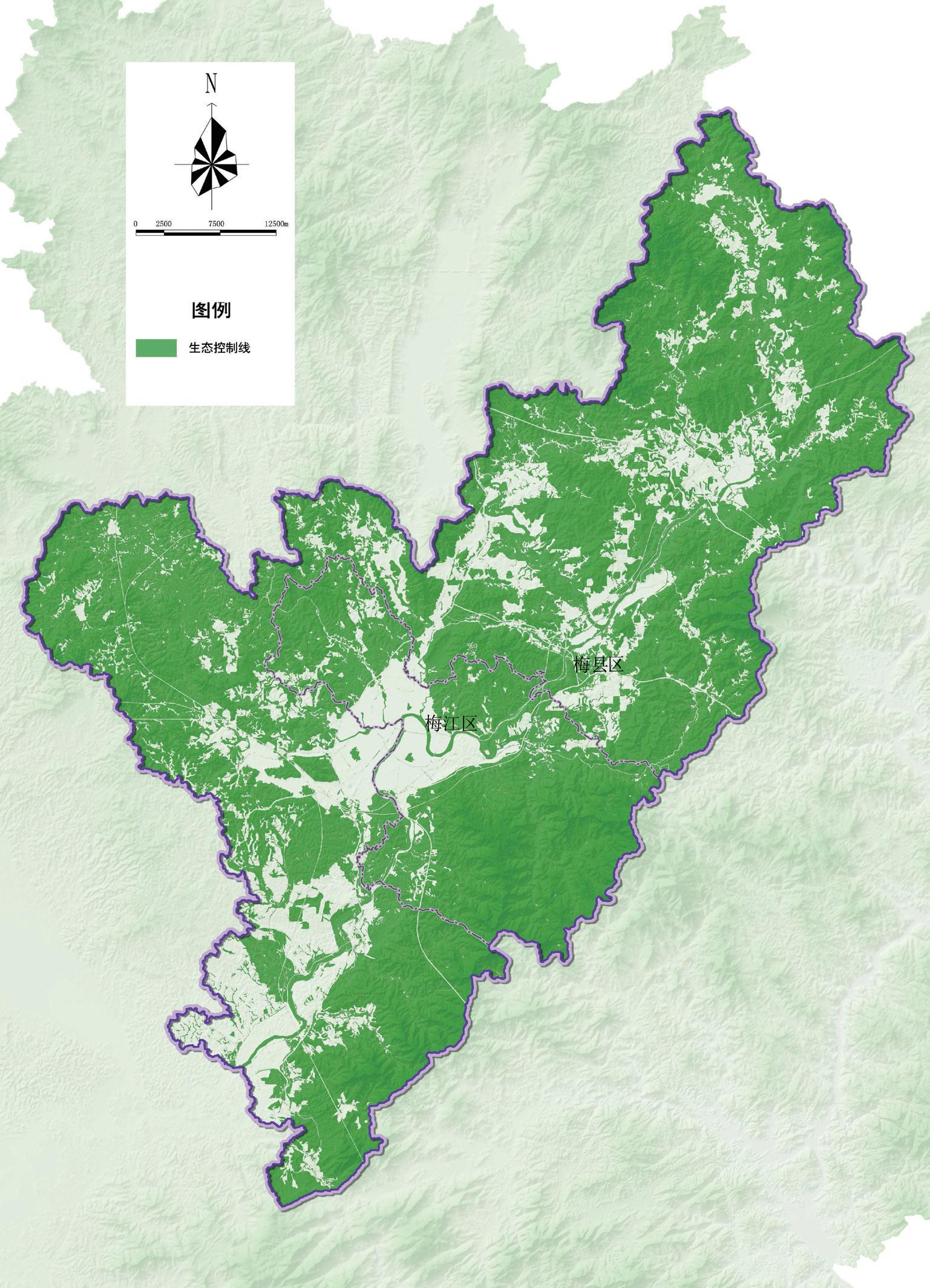 結(jié)合現(xiàn)有建設用地及未來發(fā)展需求,充分考慮經(jīng)濟、人口、規(guī)模、承載力等因素,劃定城市建設控制邊界。規(guī)劃梅州市規(guī)劃區(qū)范圍內(nèi)生態(tài)控制線劃定總面積為 2360.56 平方公里,占規(guī)劃區(qū)總面積 77.32%。