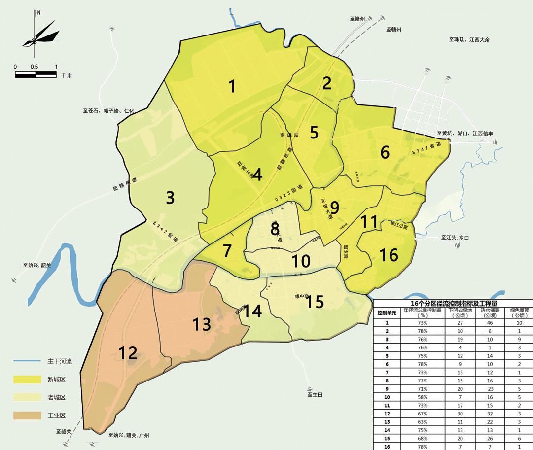 基于鴻業(yè)低影響開(kāi)發(fā)模塊,上下聯(lián)動(dòng),分解落實(shí)總體目標(biāo)。首先,自上而下,結(jié)合生態(tài)格局、自然流域、管網(wǎng)布局、行政分區(qū),劃分形成 16 個(gè)排水分區(qū);再次,自下而上,定指標(biāo),通過(guò) SWMM 模型,對(duì)不同類(lèi)型用地和不同種類(lèi)的低影響設(shè)施進(jìn)行布局,確定分區(qū)指標(biāo)。針對(duì)一般地塊設(shè)置雨水花園、綠色屋頂、生態(tài)草溝、透水鋪裝的指標(biāo)和布局條件,注重水岸邊景觀設(shè)計(jì);針對(duì)水面集中區(qū)域,通過(guò)人工濕地處理,促進(jìn)促進(jìn)水體凈化與保持水質(zhì);針對(duì)城市核心區(qū),將若干地塊作為一個(gè)整體進(jìn)行管控。