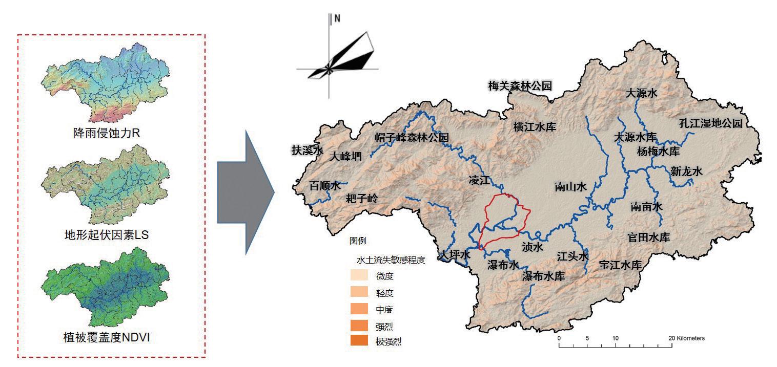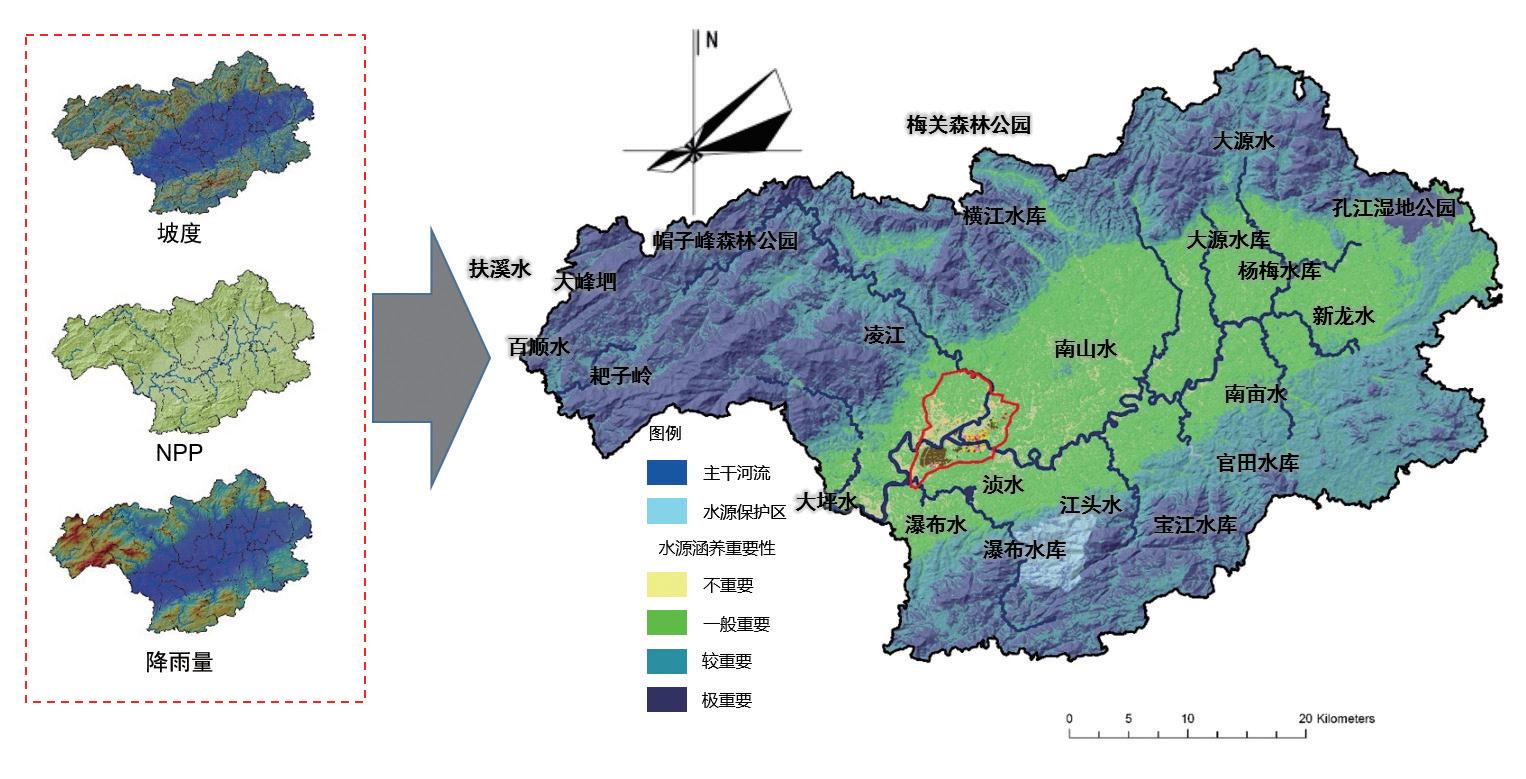 從市域角度構(gòu)建涵蓋從源頭到終端的全過(guò)程水生態(tài)安全格局構(gòu)建?;?RUSLE 模型、SCS 模型識(shí)別水土流失敏感區(qū)、水源涵養(yǎng)區(qū)進(jìn)行源頭保護(hù);基于徑流模擬識(shí)別 9 條主干河流及16 條潛在徑流路徑進(jìn)行過(guò)程管控;基于河流交匯點(diǎn),進(jìn)行終端管控。利用 30 年近 2 萬(wàn)余條降雨數(shù)據(jù),通過(guò) Mathlab 處理,計(jì)算出徑流控制率 - 設(shè)計(jì)降雨量曲線,結(jié)合《海綿城市建設(shè)技術(shù)指南》要求和降水?dāng)?shù)據(jù),確定城市的年徑流控制率為70%,設(shè)計(jì)降雨量為 18.8mm 的徑流控制目標(biāo)。