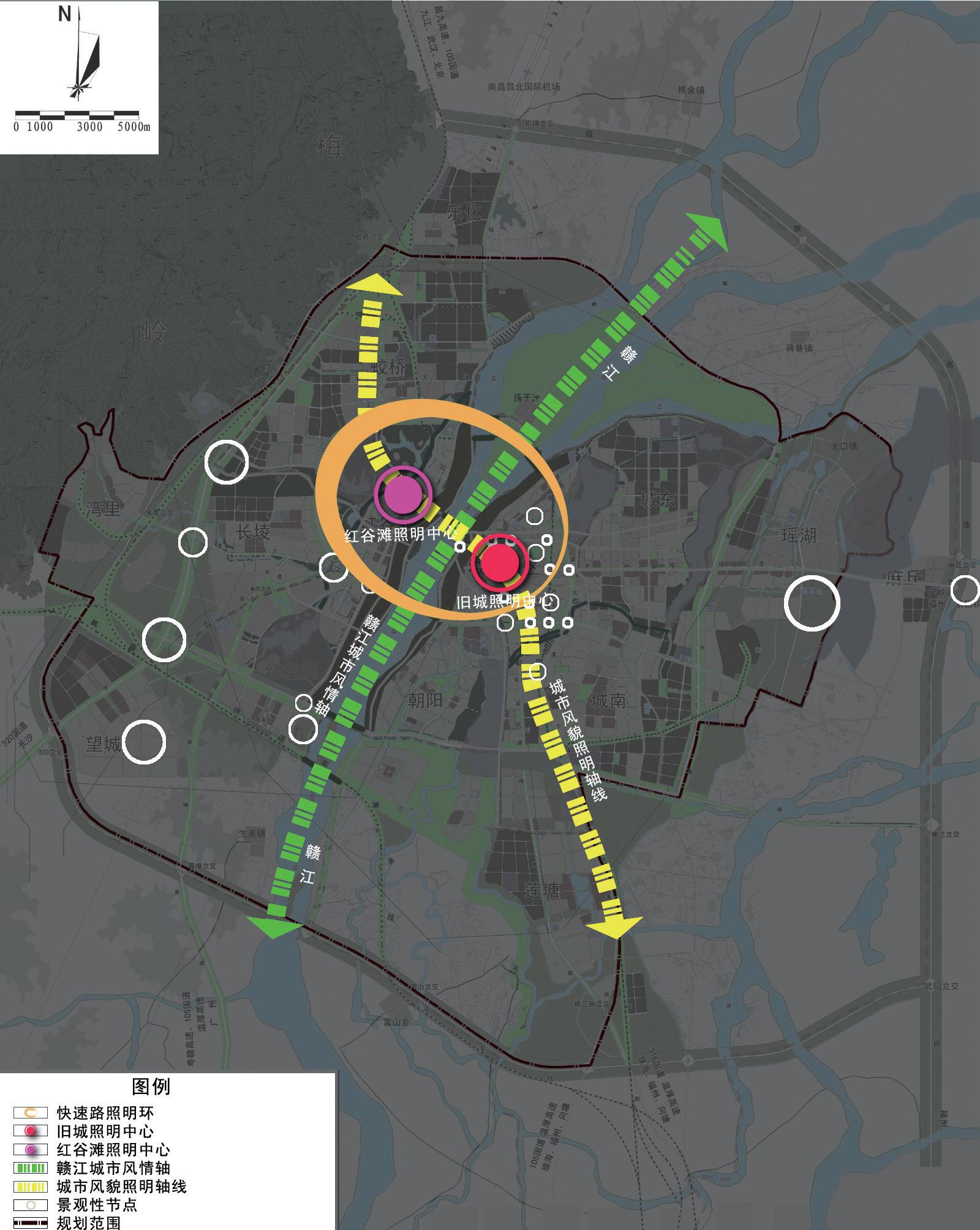 根據(jù)南昌中心城區(qū)空間布局,以促進(jìn)經(jīng)濟(jì)發(fā)展、提升城市形象為出發(fā)點,中心城區(qū)形成“一環(huán)、兩心、兩軸、多節(jié)點”的城市照明空間總體格局。