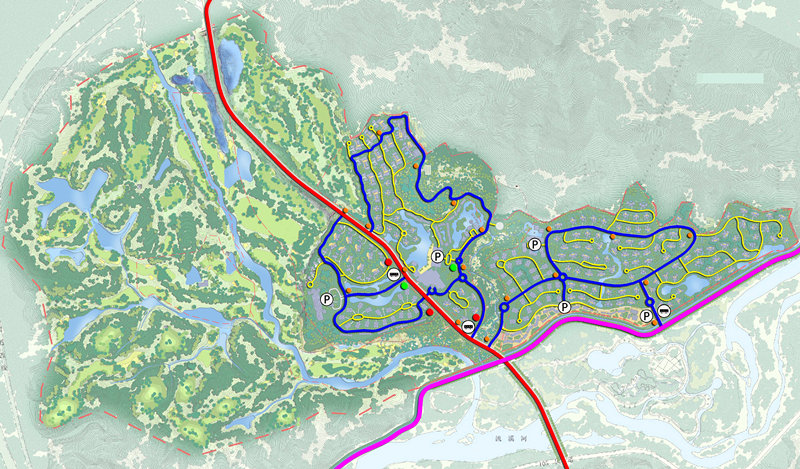 規(guī)劃結(jié)合基地獨(dú)特的地形條件,通過多方案對(duì)比研究,選取更契合規(guī)劃區(qū)地形特征的布局模式:建筑以院落式布局為主,散點(diǎn)狀、分層級(jí)與山體地形融合共生;道路走向順應(yīng)地形,最大限度的遵從自然。整體布局多維度展現(xiàn)了源于自然、高于自然的空間格局,形成極富山地特色的規(guī)劃設(shè)計(jì)方案。