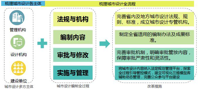 本次研究梳理了管理機構(gòu)、設計機構(gòu)、建設單位等多方主體的角色,從城市設計編制的法規(guī)與機構(gòu)、編制內(nèi)容、審批與修改、實施與管理四大方面提出了城市設計制度創(chuàng)新的改革方向及內(nèi)容。提出完善省內(nèi)城市設計法規(guī)、制定全省適用的編制辦法及成果標準,出臺全省城市設計技術(shù)指引,完善審批機制,納入法定規(guī)劃管理平臺等全過程等城市設計全過程的改革措施。