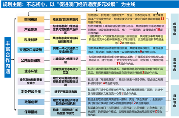 《規(guī)劃》以促進(jìn)澳門產(chǎn)業(yè)多元發(fā)展為主線,以合作、創(chuàng)新、開放為主題,緊緊圍繞“加強(qiáng)政策扶持、豐富合作內(nèi)涵、拓展合作空間、發(fā)展新興產(chǎn)業(yè)”的要求,著力發(fā)展促進(jìn)澳門經(jīng)濟(jì)適度多元的產(chǎn)業(yè)、建設(shè)優(yōu)質(zhì)共享的城市空間、構(gòu)建與港澳趨同的經(jīng)濟(jì)發(fā)展環(huán)境、探索實(shí)施珠澳共商共建共管共享模式,為澳門和珠江口西岸地區(qū)高質(zhì)量發(fā)展提供新動(dòng)能,為內(nèi)地與港澳深度合作提供示范,為豐富“一國(guó)兩制”實(shí)踐提供鮮活樣本。