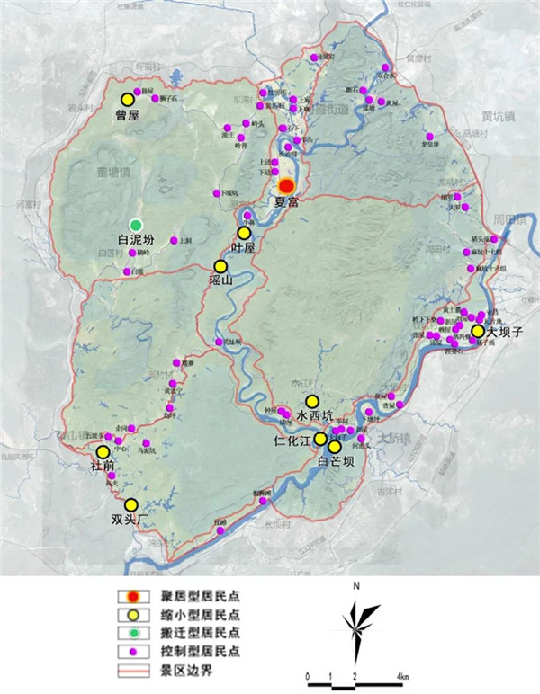 規(guī)劃確定生態(tài)保護(hù)、底線落實(shí)、適度發(fā)展的丹霞山社區(qū)建設(shè)原則,延續(xù)總體規(guī)劃將保護(hù)培育分級(jí)與社區(qū)控制相結(jié)合的思路,在特級(jí)保護(hù)區(qū)及一級(jí)保護(hù)區(qū)中不設(shè)置社區(qū);在二級(jí)和三級(jí)保護(hù)區(qū)中將人口規(guī)模小、區(qū)位偏遠(yuǎn)交通不便、存在環(huán)境影響的自然村確定為縮小型居民點(diǎn),將人口規(guī)模適中、具有一定歷史文化等旅游資源及總體規(guī)劃中的服務(wù)點(diǎn)確定為控制型居民點(diǎn),對(duì)計(jì)劃有重點(diǎn)建設(shè)項(xiàng)目及總體規(guī)劃中的服務(wù)中心確定為聚居型居民點(diǎn);此外,結(jié)合地方訴求和村民意愿,確定外遷型居民點(diǎn)。最終,規(guī)劃確定居民點(diǎn)外遷1個(gè)、逐步縮小9個(gè)、控制規(guī)模54個(gè)以及適度發(fā)展1個(gè)。