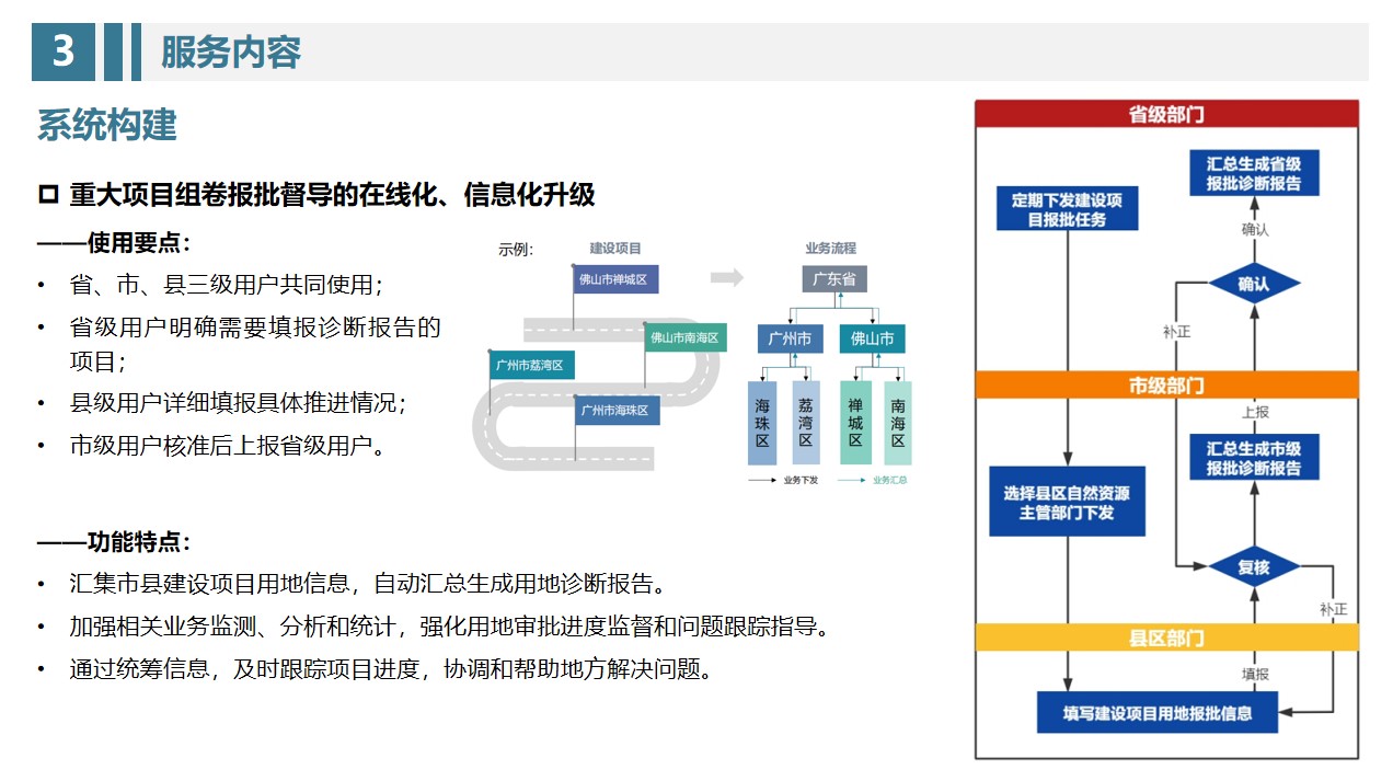 為貫徹落實(shí)廣東省人民政府辦公廳印發(fā)的《廣東省強(qiáng)化資源要素支撐 全力推進(jìn)省重大項(xiàng)目開工建設(shè)的工作方案》的要求,全面強(qiáng)化重大項(xiàng)目的資源要素精準(zhǔn)配置,充分發(fā)揮重大項(xiàng)目對經(jīng)濟(jì)社會高質(zhì)量發(fā)展的重要支撐作用,為省持續(xù)做好“六穩(wěn)”工作、落實(shí)“六?!比蝿?wù)提供保障,省自然資源廳委托我院開展本項(xiàng)目,以提高全省組卷質(zhì)量和審批效率,確保全省重大項(xiàng)目如期依法開工建設(shè),項(xiàng)目主要包括以下三項(xiàng)工作內(nèi)容:一是編寫廣東省用地審批指引,全面梳理國家、省對于用地審批的要求,對照不同審查科(處)室審查要點(diǎn),結(jié)合組卷過程中的難點(diǎn)、堵點(diǎn),分版塊形成用地報(bào)批指引。二是開發(fā)廣東省建設(shè)項(xiàng)目用地診斷工具(以下簡稱“診斷工具”)和廣東省用地審批“雙隨機(jī),一公開”檢查系統(tǒng)(以下簡稱“雙隨機(jī),一公開”系統(tǒng)),診斷工具以信息化手段,實(shí)現(xiàn)多個(gè)項(xiàng)目實(shí)時(shí)跟進(jìn)和快速調(diào)度,“雙隨機(jī),一公開”系統(tǒng)對評估全省各地用地審批權(quán)限下放,倒逼地方審批提速有重要作用。三是全流程跟進(jìn)項(xiàng)目組卷報(bào)批,建立省-市-縣-建設(shè)單位-組卷多向溝通協(xié)調(diào)機(jī)制,及時(shí)協(xié)調(diào)解決、反饋組卷過程中的難點(diǎn)堵點(diǎn),協(xié)助省級審查工作,加速重大項(xiàng)目審批落地。