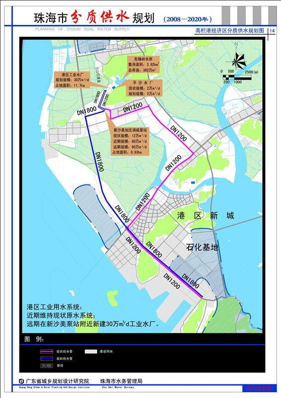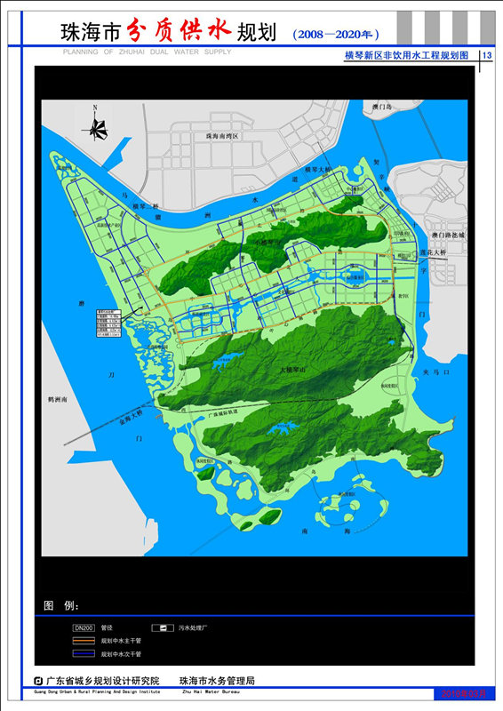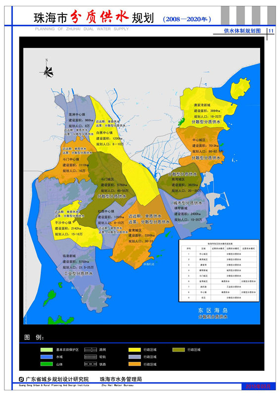 規(guī)劃通過剖析珠海市供水系統(tǒng)的特征,并尋找分質(zhì)供水與單質(zhì)供水兩種模式的技術(shù)經(jīng)濟平衡點,認為在規(guī)劃期內(nèi)珠海市不宜在所有區(qū)域推廣分質(zhì)供水,宜在部分地區(qū)開展分質(zhì)供水示范,即珠海市應(yīng)當在整體提高生活飲用水水質(zhì)的基礎(chǔ)上,有條件的工業(yè)區(qū)、新建區(qū)、海島和污水廠周邊地區(qū)采用分質(zhì)供水模式,而其它區(qū)域則宜強化節(jié)水并繼續(xù)使用傳統(tǒng)的單質(zhì)供水模式。