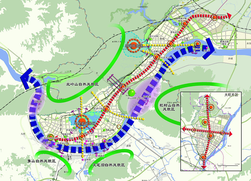 該規(guī)劃的特色在于提出了“背景(問題)-策略-規(guī)劃措施”的慎密規(guī)劃思路,響應(yīng)區(qū)域統(tǒng)籌發(fā)展,提出了中心區(qū)域規(guī)劃層次;在規(guī)劃理念上,突出資源的優(yōu)化配置,劃定了綜合性走廊;并將宏觀策略與微觀設(shè)計結(jié)合,以微觀設(shè)計落實“特色提升”策略。
