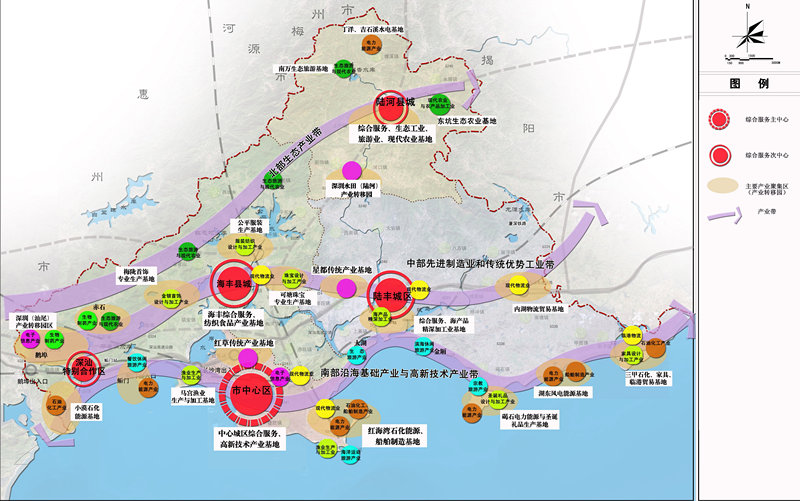 規(guī)劃沿市域北部山區(qū)、中部丘陵地區(qū)和南部濱海地區(qū)建立三條產(chǎn)業(yè)帶,重點(diǎn)發(fā)展對(duì)接珠三角產(chǎn)業(yè)配套的基地經(jīng)濟(jì),形成六大產(chǎn)業(yè)基地。