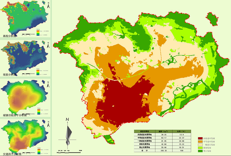 規(guī)劃借助遙感和GIS先進(jìn)技術(shù)手段,加強(qiáng)空間數(shù)據(jù)的定量分析,實(shí)現(xiàn)規(guī)劃的科學(xué)性。一是開(kāi)展鎮(zhèn)域土地適宜性評(píng)價(jià);二是處理了15年的空間屬性一體化數(shù)據(jù),定量分析土地利用的時(shí)空演變規(guī)律,包括演變數(shù)量、類(lèi)型、變化模式等,挖掘空間拓展內(nèi)在動(dòng)力,結(jié)合生態(tài)維護(hù)需求確定城鎮(zhèn)發(fā)展方向和空間結(jié)構(gòu)優(yōu)化模式;三是規(guī)劃實(shí)施后,繼續(xù)進(jìn)行動(dòng)態(tài)監(jiān)控與后續(xù)跟蹤服務(wù),以獲取的第一手?jǐn)?shù)據(jù)及時(shí)驗(yàn)證修正規(guī)劃。