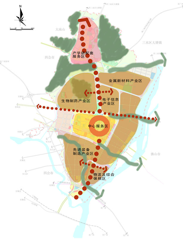 2. 以可持續(xù)發(fā)展的空間發(fā)展模式引導有機生長。為保證高新園區(qū)發(fā)展所需的服務(wù)配套和公共開敞空間,規(guī)劃控制產(chǎn)業(yè)用地不超過50%,并提出“脊軸生長?組團推進”的發(fā)展模式,力求引導空間的有機生長。