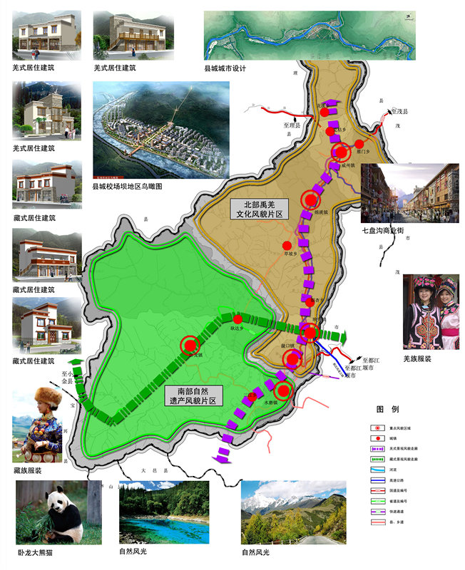 In order to ensure the smooth implementation of the layout of urban and rural space, the planning has proposed the planning concept of realizing "functional separation, land intensity, habitat security, traffic network, facilities sharing, humanization of landscape”. In view of the spillover of the function of the county after the earthquake, the planning puts forward the urban spatial structure frame of the ecological organization of the "two-center in the north and south, two-axis vertically and horizontally and five-zone" to decompose the county functions.