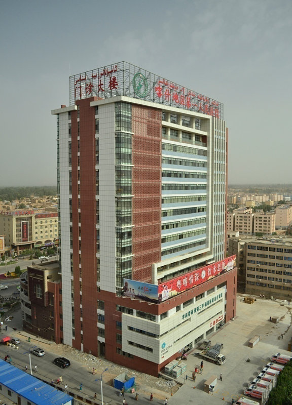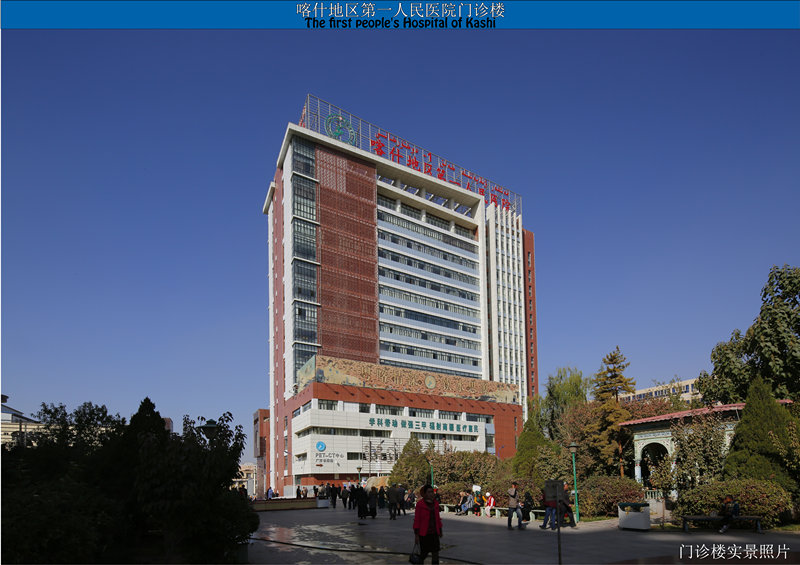 Kashi Prefecture First People's Hospital is located in the north bank of Tuman River, and No. 66 of Yingbin Avenue. The original outpatient building was in the west side of hospital region, facing Yingbin Avenue. This project belongs to the old building reconstruction project, the original outpatient building had 5 floors, with the height of 14.72 m, and the building area of 4,123.3 m2, and now it is needed to make internal and facade reconstruction; a newly built 17-floor building (excluding equipment floor) is close to the east side of old building, including the 5-floor skirt building and 1-floor basement, and the height is 62.920 m, the building area is 27,718.7 m2, and the total construction area is 31,842 m2, of which the over-ground parts mainly include outpatient department, medical technology department, inpatient department and doctor training department, covering an area of 29,612 m2 (including the old buildings), and the functions of basement include equipment room and radiotherapy department, covering a total area of 2,230 m2. The total number of beds designed is 108.